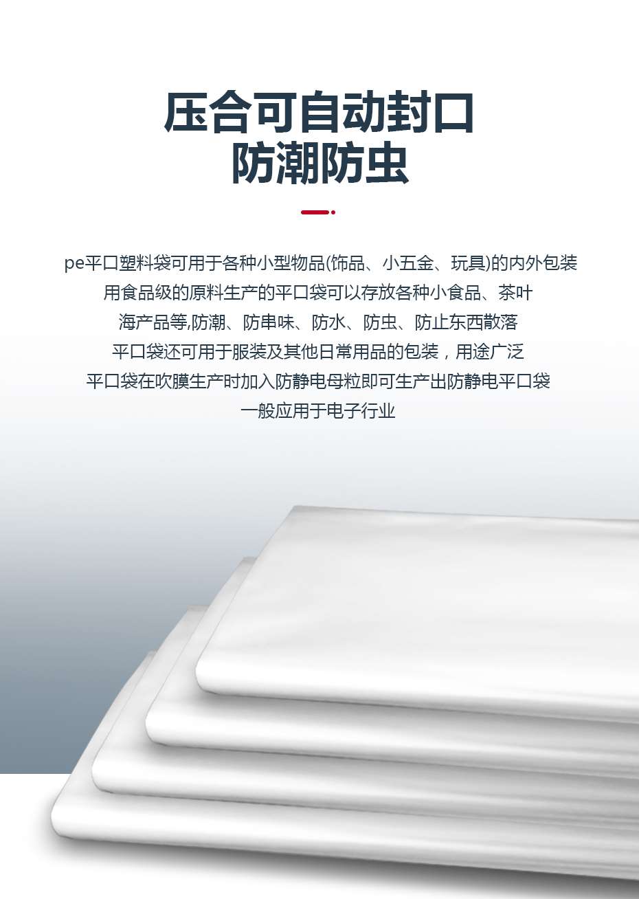 平口袋是一種壓合可自動封口的包裝袋.常見有密實袋,龍骨袋、拉鏈袋等。